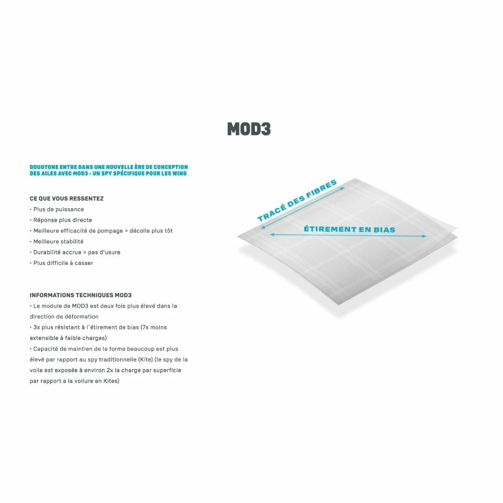 Le nouveau Mod 3 permet une canalisation de l’énérgie pour offrir des accélérations bluffantes et franches. Il permet de conserver une rigidité globale de votre aile et une résistance 3 fois supérieure à ‘étirement par rapport à une aile classique. Cet étirement réduit à son minimum confère une plus grande stabilité à votre aile et une efficacité remarquable au pompage, cela permet donc d’avoir une plage d’utilisation considérablement augmentée notamment par vent light.