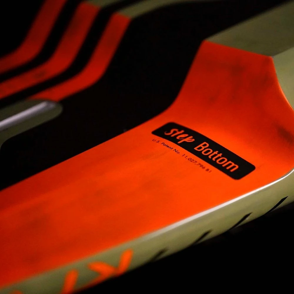 La grosse nouveauté de cette planche est le concept breveté Step Bottom, un décroché au niveau du tail qui s’étend sur quasiment 1/3 de la longeur de la planche.