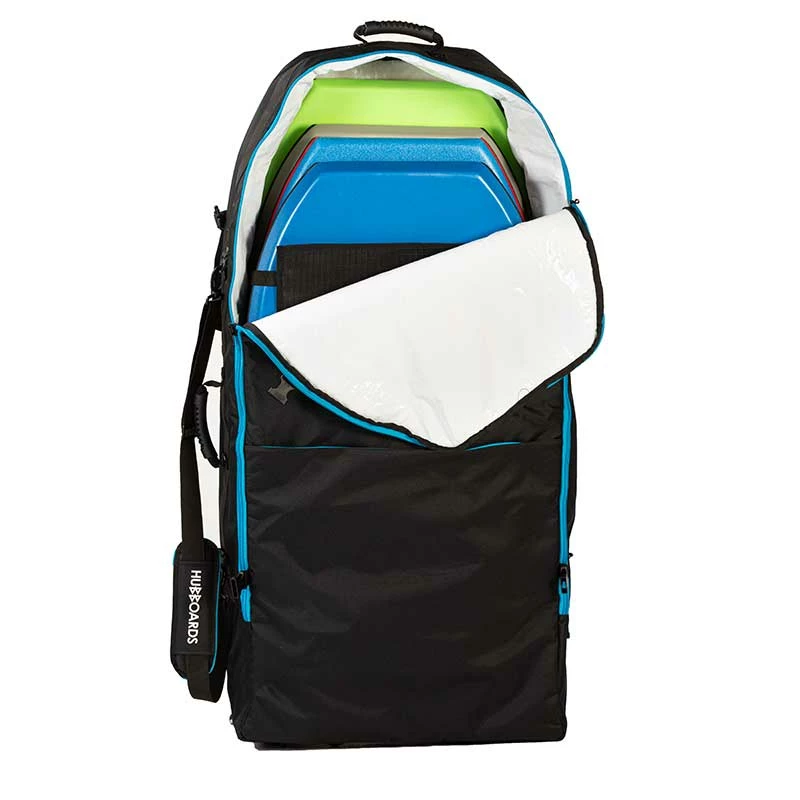 La housse de bodyboard Hubboards Wheel Board bag est une housse de voyage à roulettes pouvant contenir jusqu’à 4 bodyboards jusqu’à 45″.