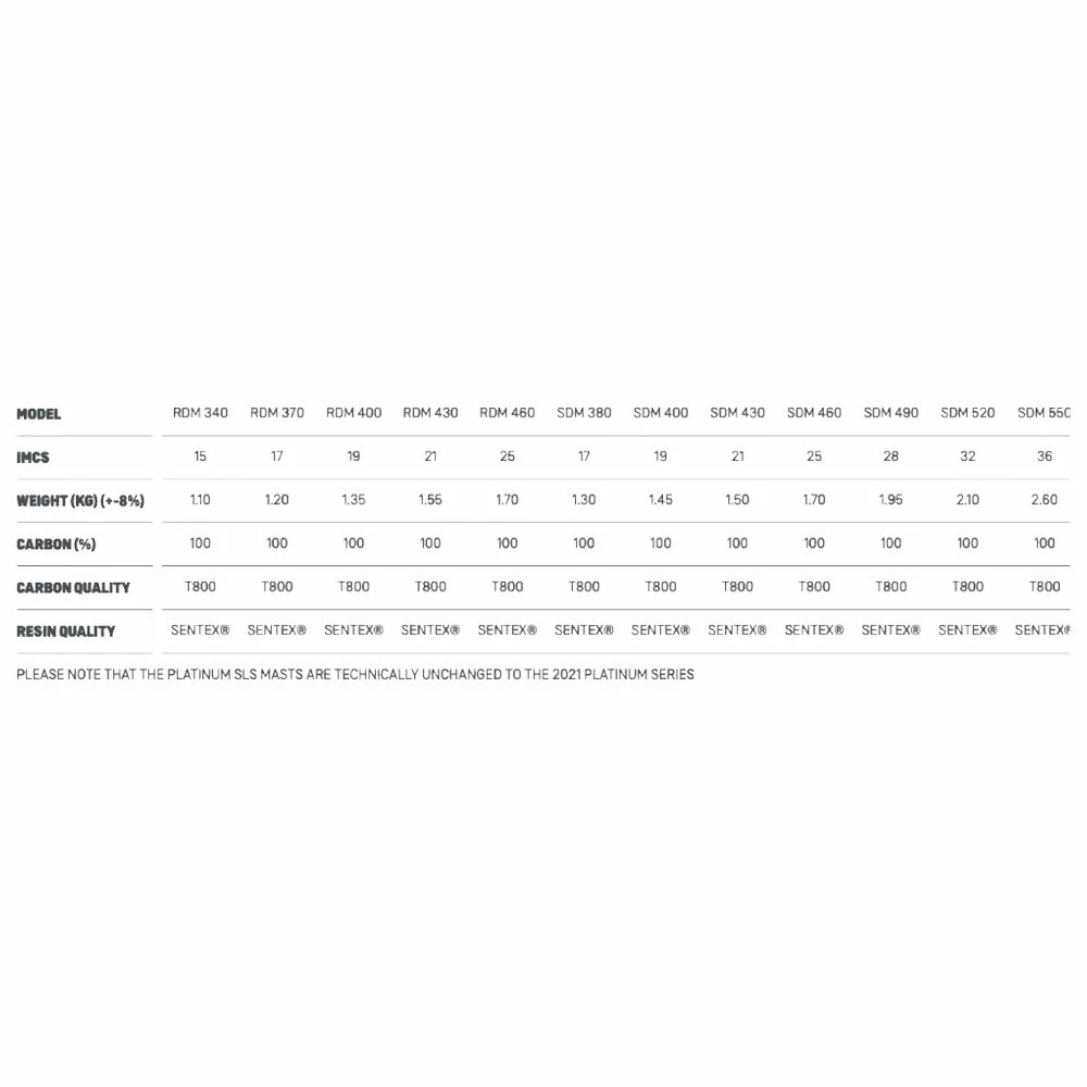 Composés de 100% de carbone, iIs ont été developpé pour les pros et ceux qui exigent le meilleur de leur matériel. Les mâts Platinum sont conçus avec technologie aérospatiale prepeg, qui offre une très grande précision et qualité.