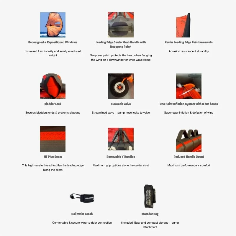 Dans son ensemble, le shape de l’aile est travaillé pour permettre à la Wing Surfer Matador d’obtenir une puissance importante et de la neutralité quand vous l’avez derrière vous.