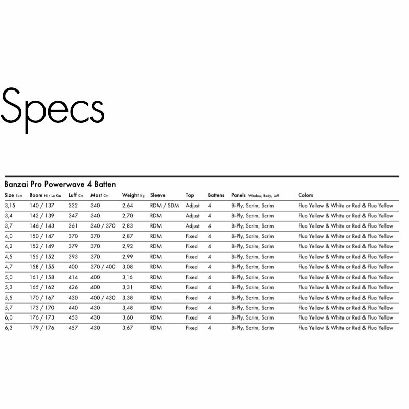 La Banzaï Pro Goya est une voile 4 lattes. Elle est construite avec des panneaux en film Bi-Ply. Ce matériel est un énorme pas en avant par rapport au mono-film. Bi-Ply sont deux couches de film transparent laminé d’une durée de vie environ trois fois plus longue que celle du mono film. Il contient un filtre anti UV et est très résistant aux plis. Vous vous rendrez compte de sa résistance en cas de lourde chute dans la fenêtre, par rapport a un mono film classique.