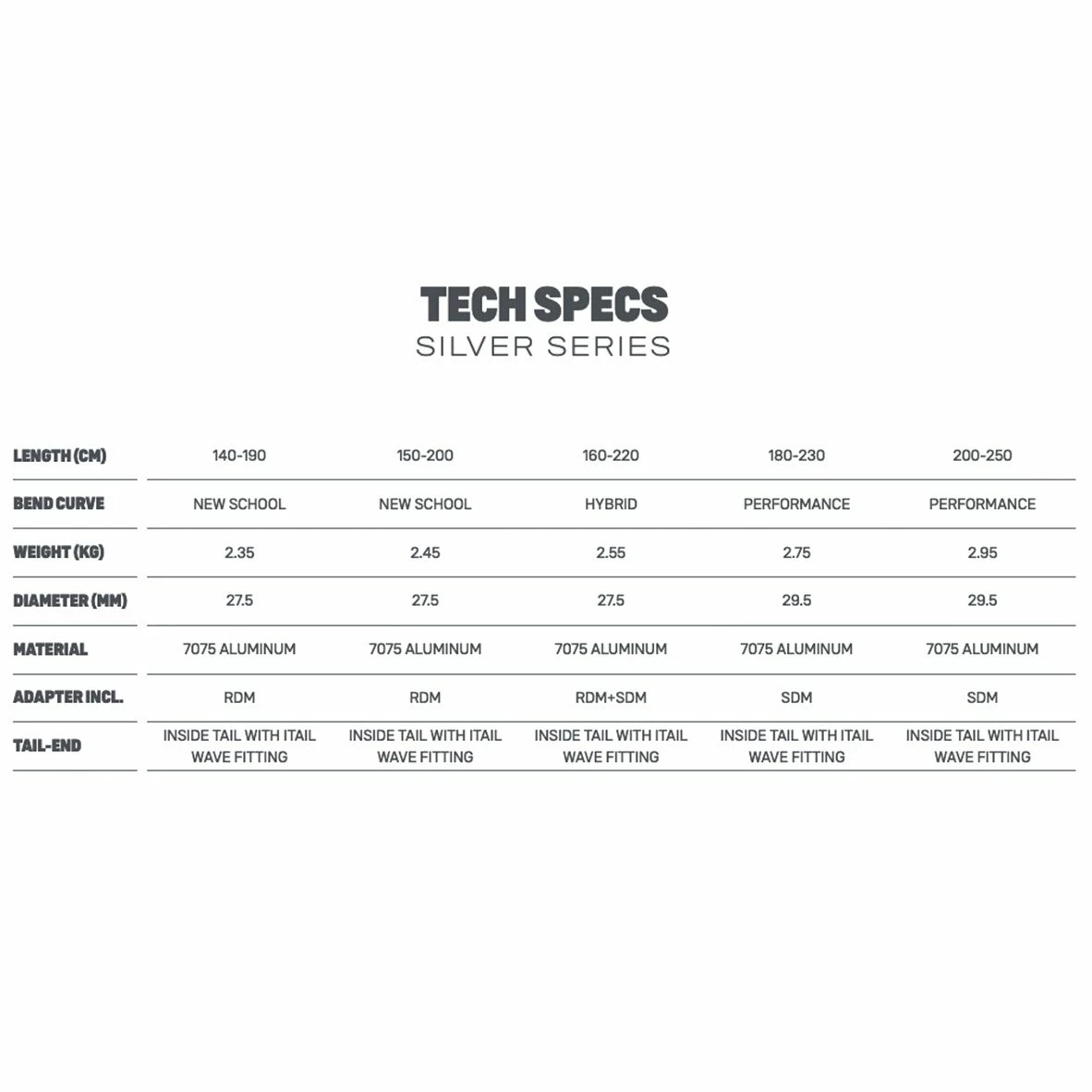 Les longueurs orientées pour une programme vague (140/190, 150/200, 160/210) ont un diamètre de 27,5mm et ont une courbure qui optimise la répartition des charges entre la main avant et arrière. Les longueurs de 180 et 200cm, plus destinées aux voiles freeride, ont un diamètre de 30mm pour plus de rigidité.